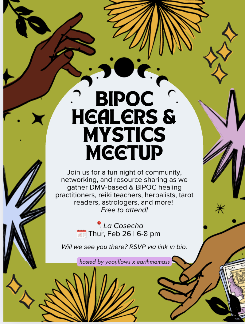 Join us for a cozy, intentional night of connection, networking, and resource sharing as we gather DMV-based & BIPOC healing practitioners - reiki teachers, herbalists, tarot readers, astrologers, bodyworkers, and more.